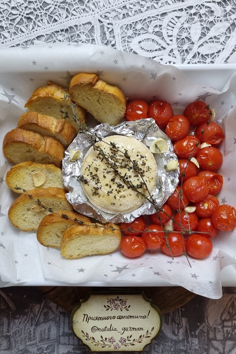 Это блюдо из тех, где минимум усилий дают вау-результат. Его несомненный плюс состоит в том, что наши сыровары делают отличный сыр камамбер, и он продается по относительно гуманной цене. При этом очень похож на оригинальный французский массового производства. Вообще камамбер - это сорт мягкого жирного сыра, изготавливаемый из коровьего молока. Имеет цвет от белого до светло-сливочного с нежным вкусом. Снаружи камамбер покрыт корочкой, образованной культурой Geotrichum candidum, поверх которой растёт белая плесень Penicillium camemberti. Камамбер прекрасно ведет себя при термообработке, чем активно пользуются кулинары всего мира. Ингредиенты: 1. В форму для запекания кладем по центру сыр. 2. С одной стороны формы размещаем помидоры черри. 3. С другой смазанные оливковым маслом ломтики багета 4. Смешиваем 2 чайные ложки оливкового масла с сушеным базиликом и смазываем этой смесью сыр сверху. 5. Поливаем помидоры сверху оливковым маслом, немного солим и перчим. Распределяем по черри чесно