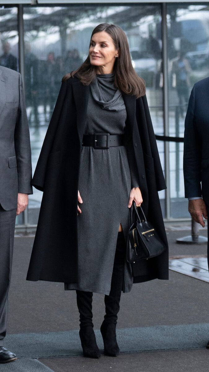 Королева Летиция появилась в идеальном образе, который вам стоит повторить этой зимой. Она надела трикотажное серое платье с разрезом и драпировкой на груди, которое подчеркнула широким кожаным ремнем. Поверх наряда Летиция накинула лаконичное черное пальто и завершила выход высокими ботфортами на каблуке и универсальной сумкой. Читайте также на нашем сайте: Подписывайтесь на нас в Телеграме, чтобы быть в курсе последних новостей!