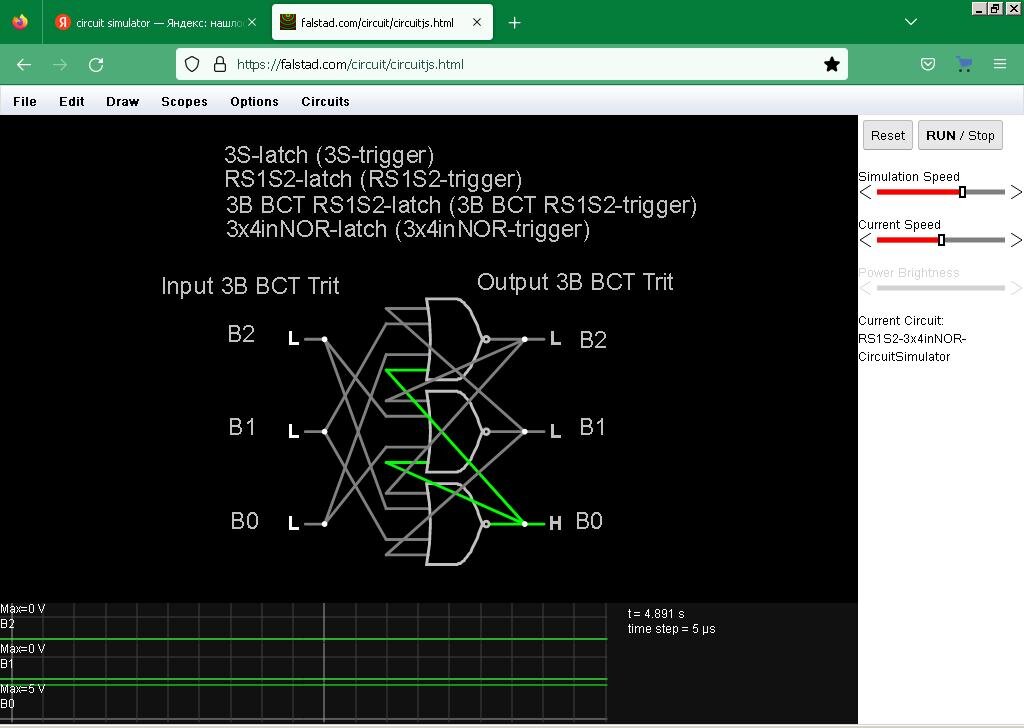 "Даром дадено, даром давайте", - И. Христос. Известен троичный трёхбитный P0P1P2-триггер на трёх логических элементах 3ИЛИ-НЕ (3inNOR) [1][2] с временем срабатывания в две типовые задержки, но управление им не всегда удобно. Известен троичный трёхбитный RS1S2-триггер на трёх логических элементах 3ИЛИ-НЕ (3inNOR) и трёх логических элементах 2ИЛИ (2inOR) с более удобным управлением с временем срабатывания в три типовые задержки [3], но он на одну типовую задержку менее быстродействующий, чем P0P1P2-триггер (P0P1P2-latch). Вниманию читателей предлагается быстрый троичный трёхбитный одноступенчатый триггер с удобным управлением работающий в прямой логике в базисе ИЛИ-НЕ (NOR) на трёх логических элементах 4ИЛИ-НЕ (4inNOR) с временем срабатывания в две типовых задержки. Быстродействие быстрого асинхронного одноступенчатого троичного трёхбитного 3x4ИЛИ-НЕ-триггера такое же, как и у двоичного RS-триггера на двух логических элементах 2ИЛИ-НЕ (2x2inNOR-latch). Рис.1. Снимок модели быстрого тр