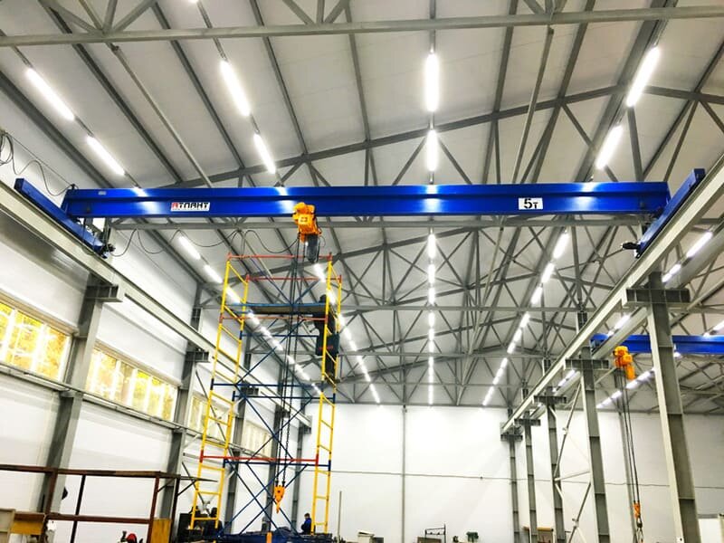 При выборе кранового оборудования, в частности мостового крана, мы обращаем внимание на качество узлов, металла и надежность конструкций. Что упускают многие новички, планирующие работать с тяжелой техникой? Правильно – качественное освещение, которое отвечает за безопасность и комфорт работы. Работать на стройке, в цеху или производственном участке можно только с хорошим освещением. Причем это не только подкрановое освещение и дополнительные технические приборы. Итак, какое освещение должно быть на каждом оборудовании по типу мостового крана? Освещение подкрановое В первую очередь специалисты учитывают необходимость установки подкранового освещения для мостового крана. Дело в том, что огромная балка постоянно передвигается по территории и перекрывает обычные светильники, установленные в цеху. Однако рабочая зона должна быть хорошо освещена в любое время суток. Важно. Без освещения работать нельзя по нормативам и правилам. Если мостовой кран будет перекрывать видимость и свет, это буде