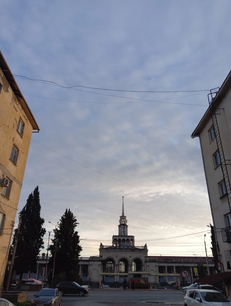 Сухум ж/д вокзал. Архитекторы Леван и Лола Мушкудиани. Открытие в 1940 году. На станции находится здание вокзала, по состоянию на 2022 год руинировано. По соседству работает восстановленный кассовый павильон, где можно приобрести не только билеты на поезд, но и на самолёт. Руины по оживленной улице Эшба, в соседстве с ж/д вокзалом: Останки здания напротив ж/д вокзала. В стене видны следы от попадания пуль: