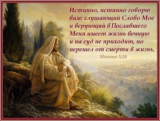 «Истинно, истинно говорю вам: слушающий слово Моё и верующий в Пославшего Меня имеет жизнь вечную и на суд не приходит, но перешёл от смерти в жизнь. Истинно, истинно говорю вам: наступает время, и настало уже, когда мёртвые услышат глас Сына Божьего и, услышав, оживут. Ибо, как Отец имеет жизнь в Самом Себе, так и Сыну дал иметь жизнь в Самом Себе. И дал Ему власть производить и суд, потому что Он есть Сын Человеческий. Не дивитесь этому, ибо наступает время, в которое все, находящиеся в могилах, услышат глас Сына Божьего и выйдут: творившие добро — в воскресение жизни, а делавшие зло — в воскресение осуждения» (Ин. 5:24–29).