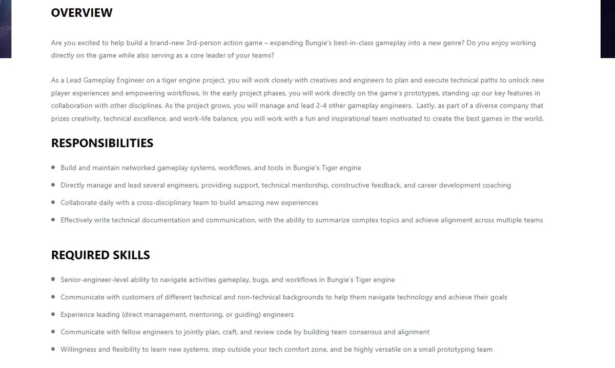 В этом году американский разработчик Bungie стал частью PlayStation Studios, однако пока от компаний не было никаких подробностей о следующем проекте авторов первых частей Halo и серии Destiny. Но вот в сети уже есть несколько намеков на этот счет: летом открытые вакансии намекали на новую игру Destiny, а в октябре инсайдер Том Хендерсон рассказал о возможном воскрешении франшизы Marathon. Теперь же этот список пополнила еще одна идея. Внимательные пользователи обнаружили, что у Bungie появилась новая вакансия ведущего инженера по геймплею, которому предстоит помогать студии разрабатывать "совершенно новую экшен-игру от третьего лица". Также в ней указывается, что кандидату предстоит работать с внутренним движком студии Tiger, на котором была сделана Destiny 2. Возможно, этот новый экшен от третьего лица как-то связан с торговой маркой Matter, которая была зарегистрирована в 2018 году американским разработчиком. Что насчет релиза новой игры, то ранее Bungie заявила о планах выпустить п