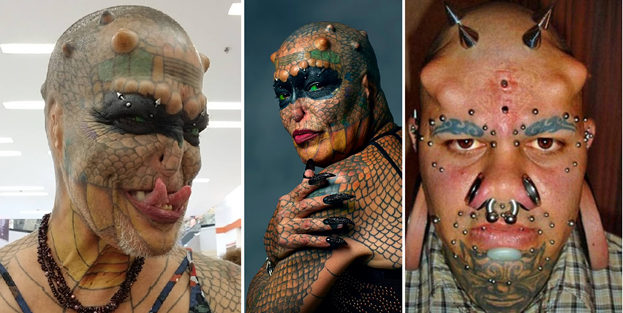Вот подборка фото людей, получивших мировую известность, благодаря экстремальным модификациям: 1. Рольф Бухгольц, является рекордсменом по количеству модификаций тела одного человека, согласно Книге рекордов. 2. Мария Хосе Кристерна Мендес «Женщина-вампир» — мексиканский юрист, бизнес-леди, активистка и татуировщик, известна своими обширными модификациями тела. 3. Элайн Дэвидсон родилась в Бразилии. В прошлом работала медицинской сес