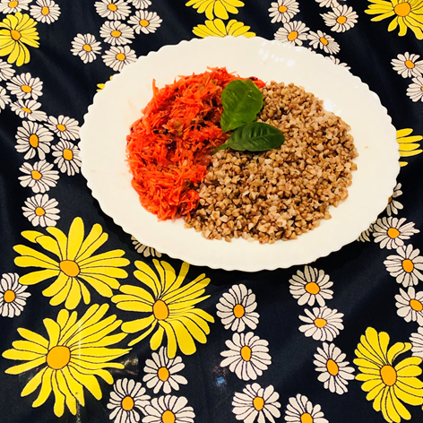 «Веган Мангалам» (русская душой, сама не зная почему)… любила индийскую кухню. Но зачастую питалась традиционно русскими продуктами. Например, вот такой «Русской трапезой» на ромашковой скатерти. Ингредиенты: Гречу тщательно промываем в холодной воде. Засыпаем в холодную подсоленную воду. Доводим до кипения, варим в течение 10 минут и сливаем. Первая часть блюда готова. Пока варится гречка, готовим вторую часть блюда. Для этого: Сырую морковь трем на мелкой терке. Свежую клюкву промываем в холодной воде. Или размораживаем замороженную. Давим с помощью давилки или измельчаем другим способом. Берем одно яблоко. Кислое или сладкое - всё равно. Например, вот такое симпатичное. Натираем яблоко на крупной терке. Тщательно перемешиваем морковь, клюкву и яблоко. Выкладываем обе части блюда (гречку и салатик) на тарелку. И кушаем. Приятного аппетита и всех-всех благ!