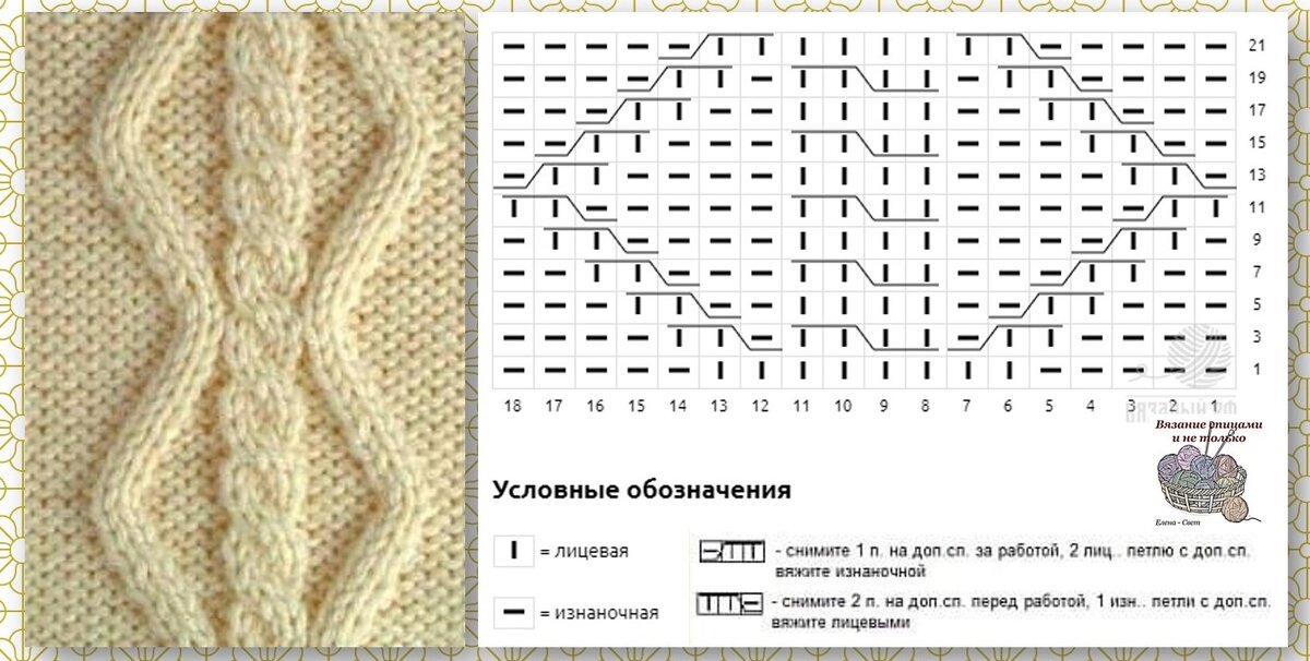 Добрый день, дорогие друзья! Предлагаю вам для вдохновения несложный узор спицами для варежек, шапочек и других изделий. Справиться сможет даже начинающая вязальщица. Раппорт узора состоит из 18 петель и 22 рядов. На схеме даны только лицевые ряды. Петли обозначены так, как они выглядят с лицевой стороны. Описание узора 1 ряд: 5 изн., 8 лиц., 5 изн. 2 ряд и все четные: вяжем по рисунку, т.е. над лицевой петлей вяжем лицевую, над изнаночной - изнаночную 3 ряд: 4 изн., снять 1 петлю на доп спицу, 2 лиц., петлю с доп спицы связать изнаночной, 2 петли снять на доп спицу и оставить перед работой, 2 лиц., 2 петли с доп спицы провязать лицевыми, 2 лиц. снять на доп спицу и оставить перед работой, 1 изн., 2 петли с доп спицы провязать лицевыми, 4 изн. 5 ряд: 3 изн., снять 1 петлю на доп спицу, 2 лиц., петлю с доп спицы связать изнаночной, 1 изн., 4 лиц., 1 изн.. 2 лиц. снять на доп спицу и оставить перед работой, 1 изн., 2 петли с доп спицы провязать лицевыми, 3 изн. 7 ряд: 2 изн., снять 1 п