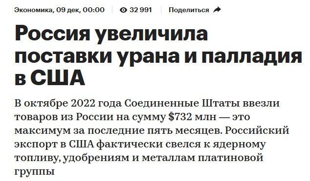 Экспорт России в США после достигнутых пиков в марте начал резко снижаться из-за введенных санкций и резкого поднятия до 35% ввозных пошлин на популярные российские товары. К сентябрю от показателя, близкого к 3 млрд долларов в месяц, поставки упали до рекордного минимума в 332,1 млн (примерно в 9 раз). Однако, октябрь вдруг показал неожиданный рост экспорта России в США в 2,2 раза (по отношению к сентябрю) - показатель составил 732,4 млн долларов. И такой рост был достигнут за счет поставок... урана и палладия. РБК приводит график, на котором видна динамика внешней торговли России и США в 2022 году. Исходя из детальной статистики импорта, публикуемой Бюро переписей США (официальное статистическое ведомство страны), видно, что весь российский экспорт в эту страну сводится к трем основным категориям товаров. Это: 1. Ядерное топливо (обогащенный уран). 2. Драгоценные металлы палладиевой группы. 3. Удобрения. Импорт всех остальных товарных групп упал практически до нуля. Например, импорт