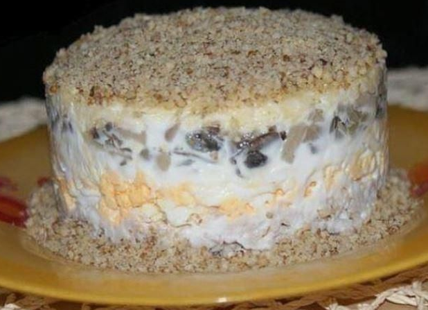 Приветствую Вас, дорогие подписчики и читатели! Делюсь еще одним рецептом замечательного салата, который способен украсить любой праздничный стол. Нам понадобится: Процесс приготовления: Курицу отварить. Нарезать маленькими кусочками или кубиком. Шампиньоны и лучок нарезать и обжарить на сковородке в подсолнечном масле до готовности. Вареные яйца нарезать маленькими кусочками или натереть на терке. Твердый сыр натереть на средней терке. Чеснок измельчить и добавить к сыру. Заправить майонезом и хорошенечко перемешать. Грецкие орешки можно измельчить, а можно использовать и целыми. Выкладываем салат слоями: №1: курица; №2: яйца; №3: шампиньоны с лучком; №4: сыр и чеснок; №5: орешки. Каждый слой промазываем майонезом, за исключением уже промазанного сыра с чесноком. По желанию можно украсить еще зеленью. Салат готов, он прекрасно дополнит Ваш праздничный стол. Подавайте его гостям, друзьям, радуйте свою семью. Приятного аппетита!