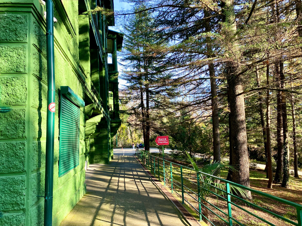 В общем, тогда, в 2020 поверхностно познакомились с этой достопримечательность, поэтому ощущения от увиденного были такими: да, территория красивая, здание нестандартного глубокого зеленого цвета (таких вроде и нет больше особо нигде), яркие олеандры органично вписываются в общую картину, красивый хвойный парк...