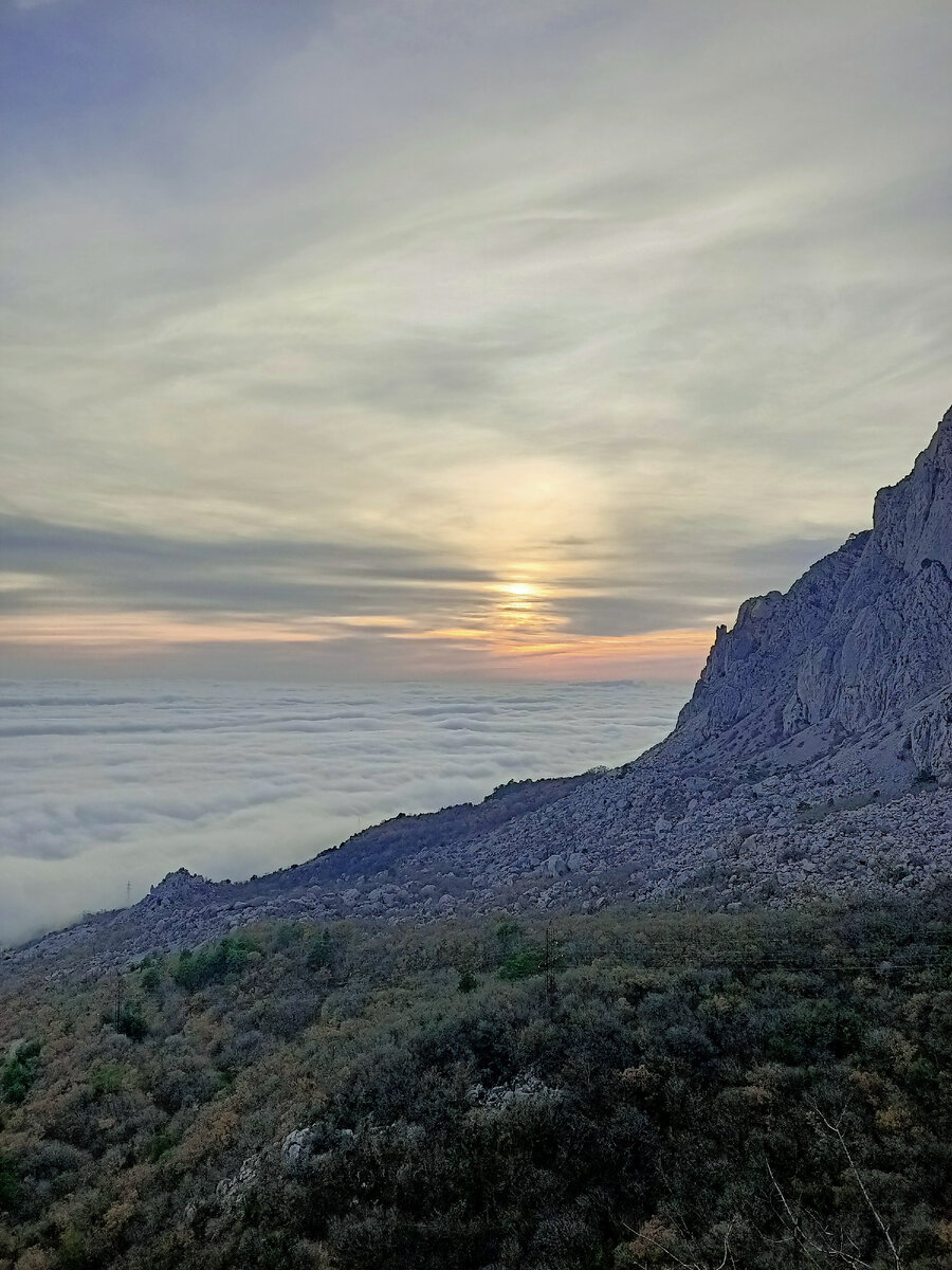 Чёрное море скрылось от глаз под плотным белым одеялом тумана. У самого берега кажется, что идёт мелкий дождик, лобовое стекло мгновенно покрывается капельками, а когда поднимаешься выше, то по мановению волшебной палочки туманный дождь прекращается. Обычно это весеннее явление, когда температура воздуха резко повышается, но иногда... В среду температура ночью упала ниже нуля, а вчера в субботу поднялась до + 16, а в Симферополе было даже + 20. Вот и накрылась морская гладь и прибрежная полоса плотным белым одеялом. Красиво! А когда солнышко начинает опускаться при заходе, то окрашивает белый туман в розоватые, красноватые, оранжевые тона. #природа #туман #облако #черноеморе #крым