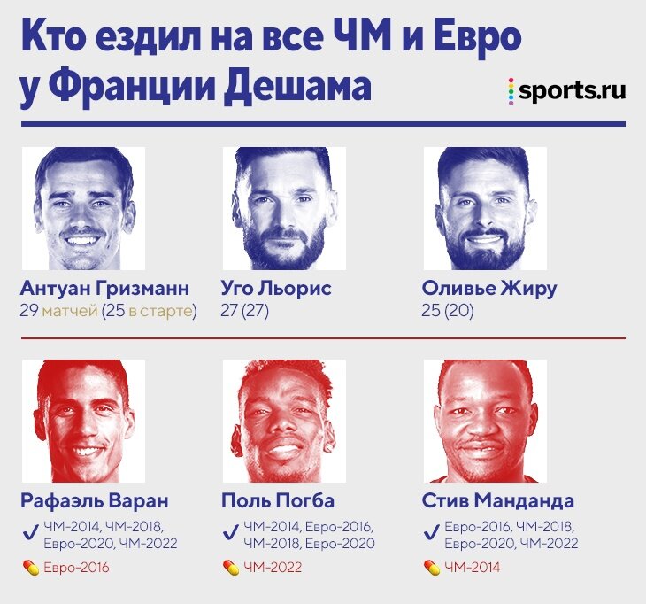 Новый заход Франции на титул – снова без Бензема. В Катар не приехал не только Карим – из-за травм Дешам лишился Канте и Погба (а Матюиди фактически закончил карьеру). От золотого центра поля ничего не осталось, поэтому тренеру пришлось доверять Рабьо (Орельен Тчуамени мог выходить и вместе с Канте) и придумывать очередную роль для Гризманна.