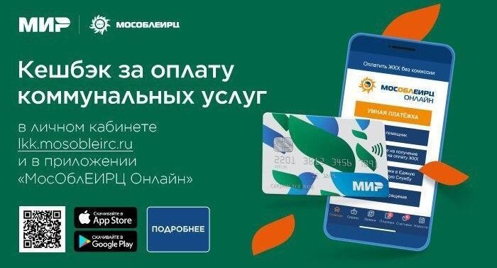 Жители Московской области, оплачивающие коммунальные счета через личный кабинет МосОблЕИРЦ, могут воспользоваться программой лояльности «Кешбэк «Мир»». За несколько месяцев по одному лицевому счету абоненты могли получить в общей сложности до одной тысячи рублей. Процедура получения кешбэка является несложной. Для частичного возврата средств требуется зарегистрироваться в программе лояльности и своевременно оплачивать с помощью платёжной системы «Мир» жилищно-коммунальные услуги. С июля 2021 года, когда начала действовать акция, 214 тысяч клиентов МосОблЕИРЦ смогли вернуть около 55 миллионов рублей.