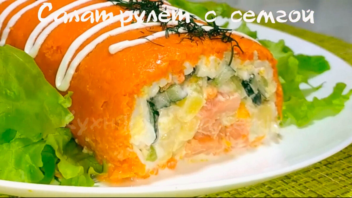 Яркий, свежий, очень нежный и вкусный салат с семгой! Его можно приготовить в виде рулета или просто выложить все ингредиенты слоями. Приготовьте такой салат на Новый год 2023 и он точно не останется без внимания гостей! Время приготовления: 60 мин. Кол-во порций: 6-8 Калорийность: Итого: 569 ккал (Б- 35, Ж- 25, У- 48) На 100 гр: 63 ккал 🍡Ингредиенты: 🍡Приготовление: 1. Подготовить все ингредиенты. Морковь, картофель и яйца отварить, очистить и остудить. Циновку застелить пищевой пленкой или целлофановым пакетом; 2. На пленку выложить морковь, натертую на мелкой терке, в форме квадрата или прямоугольника и хорошо разровнять; 3. На морковь выложить яйца, натертые на крупной терке, немного не доходя до краев; 4. На яйца выложить слой из огурцов, нарезанных мелкой соломкой, также, немного не доходя до краев; 5. На огурцы выложить картофель, нарезанный мелкими кубиками; 6. Далее в середину на картофель выложить семгу, нарезанную мелкими кубиками; 7. Каждый слой промазать сеточк