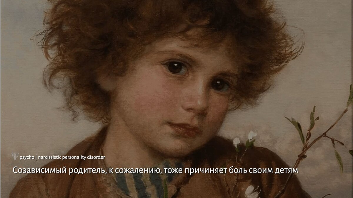 Хотя я предполагаю, что созависимые разделяют ответственность за вред, причиненный их детям, необходимо проявлять осторожность при приписывании вины. Созависимые родители аналогичным образом выросли в семье, в которой все дети находились в плену пренебрежения и/или жестокого обращения со стороны созависимого и патологически нарциссического родителя. Они явно являются жертвами окружения своего детства. Кроме того, без их попыток защитить своих детей, а также любви и заботы, которые они им оказывали, общий психологический вред детям был бы нанесен намного больше по сравнению с воспитанием исключительно патологическим нарциссом.