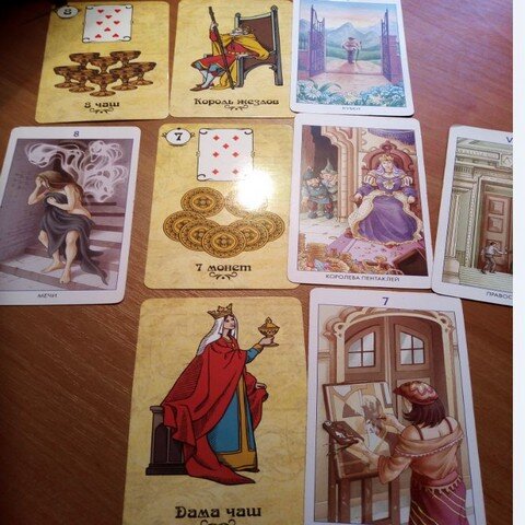 Рядом снова легка Восьмерка кубков, но уже из колоды 78 Дверей. Как видите, карты сами подсказывают, на какую именно сферу жизни следует обратить особое внимание. Данный аркан – еще одно свидетельство того, что вы сейчас находитесь в поиске новых идей. Но своими планами не хотите на данном этапе ни с кем делиться.