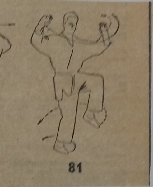 23. Поворот и удар пяткой. (81-83). Не опуская левую ногу, перенесите её вправо, сгибая колено так, чтобы бедро левой ноги оказалось параллельно полу , а колено повёрнуто на северо-запад. Кисти рук сведены вместе уровне лица.(81). Повернитесь против часовой стрелки на пятке правой ноги на 180°.(82). Разведя одновременно руки в стороны ладонями вперёд на уровне плеч, выбросить вперёд левую ногу и сделайте левой пяткой удар прямо вперёд (83). 24. Почистить колено. (84-86). Опустите левую ногу и сделайте ею шаг вперёд, перенеся на левую ногу массу тела. Одновременно левая рука опускается вниз и делает обметающее движение около левого колена, а правая рука движется вперёд (ладонь вперёд) на уровне груди, оставаясь полувыпрямленно в локте (84). Перенесите массу тела на правую ногу, поворачивая на пятке стопу левой ноги на северо-восток. После этого, перенеся массу тела на левую ногу, сделайте правой ногой шаг вперёд и перенесите на неё массу тела (85), одновременно левая рука оп
