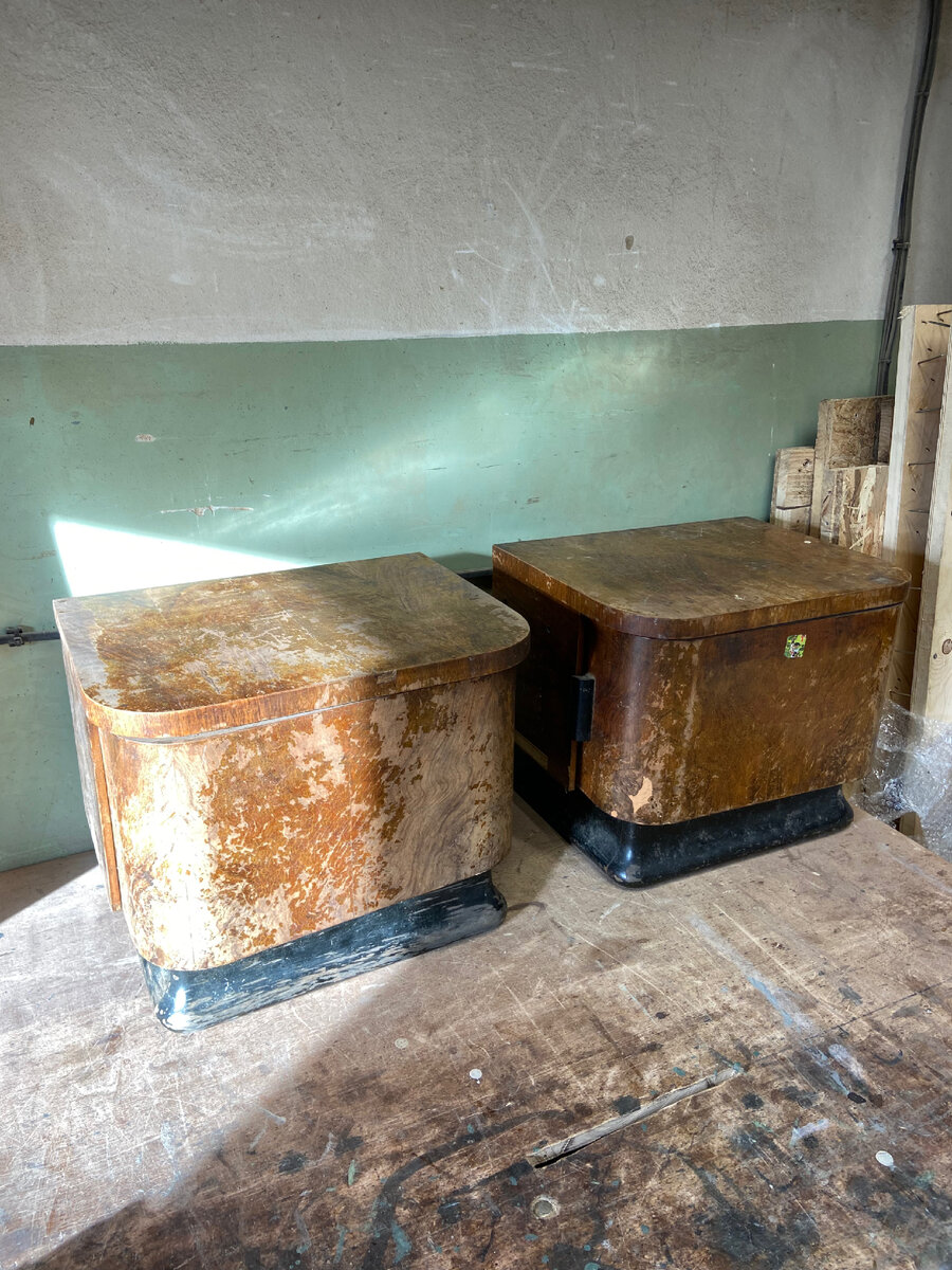 Привезли мне пару прикроватных тумбочек. Как оказалось при разговоре, они стали прикроватными тумбочками не сразу. Изначально это было трюмо) потом трюмо разобрали, немного подпилили и получились прекрасные тумбочки. Начнем осмотр. А дело то печальное. Облезлый лак это вообще не проблема, облезлый шпон- проблема. Сильнее всего пострадали дверцы. Особенно на изгибах шпон вздулся, потрескался и местами отвалился. А шпон с красивым рисунком. Немного прикинув свои возможности приступаем в плану А. Разбираем и чистим. Где-то лак отходит и с помощью наждачной бумаги, где-то нужно использовать более серьезный инструмент. В последнее время начинаю верить в ауру старой мебели и ее прошлых владельцев. Иногда работа проходит легко и само все получается, а иногда запинки на каждом этапе. Параллельно зачистке начинаю подклеивать совсем слабые места. Пока все пыльное, выглядит ничего, но присмотревшись и под новым покрытием не факт, что будет хорошо. А это то в чем заключается пробле