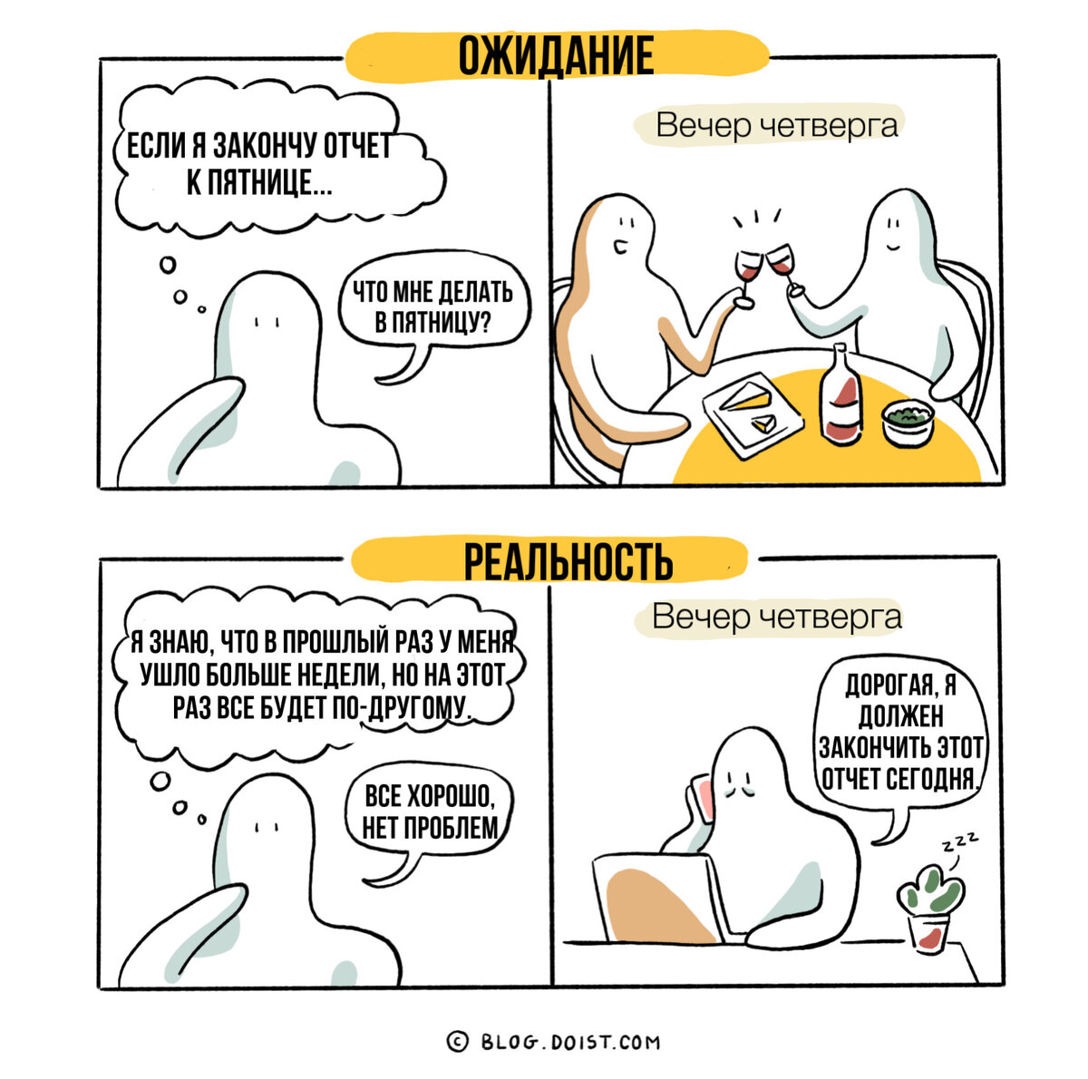 Привет, милый друг! Если ты планируешь прогуляться на свежем воздухе, повеселиться с друзьями или любимым, посмотреть фильм или почитать книгу на выходных, но в эти дни твои планы могут измениться из-за домашних дел или других занятий. В это время твоя жизнь становится ожиданием и реальностью, как в этом комиксе. Многих людей раздражают идеальные мамы из Instagram и это неудивительно: когда заниматься собой, если семья требует постоянного внимания, плюс работа, плюс забота о родителях? Брайан Гордон в своих «Комиксах на птичьем языке». Ты можешь много думать о создании семьи и о том, как именно будут проходить будни, когда появится ребенок, но скорее всего твои фантазии будут далеки от действительности. Например, у художницы Любови Соболь после рождения детей разрушились иллюзии относительно прогулок. Иногда хочется бросить все дела и отдохнуть от работы в одиночестве. Но те, у кого есть дети находятся в такой же ситуации, как у Брайана Гордона. Скоро у тебя день рождения, ты ждёшь ве