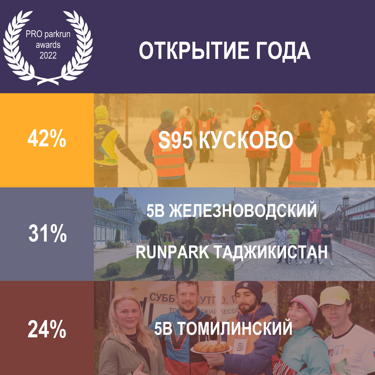 Мы начинаем подводить итоги года! И первая номинация, которой мы открываем PRO parkrun awards'22: "Открытие года" В ней пойдет речь о забегах всех российских систем, которые появились в этом году. Не перезапуск, не старт под другим флагом, а именно первый старт паркового забега, не проводившегося ранее. Итоги выглядят следующим образом: Тройка победителей выглядит так: 1. S95 Кусково (Москва) - 42% голосов Читайте наш обзор с открытия: 2. Одинаковое количество голосов набрали открытия 5 вёрст в Железноводске и запуск runpark в Таджикистане - 31% Свежий выпуск подкаста с командой из Железноводска: Интервью с организаторами runpark в Таджикистане: 3. 5 вёрст в Томилинском лесопарке - 24% голосов Читайте наш обзор с открытия: И вот что по этому поводу говорят наши эксперты! Про S95 Кусково: Парк Кусково, имеет свою огромную беговую аудиторию и долго оставался без своих субботних пробежек! И вот это случилось, я считаю это большой успех, как для парка так и для бегунов! Важным открытием