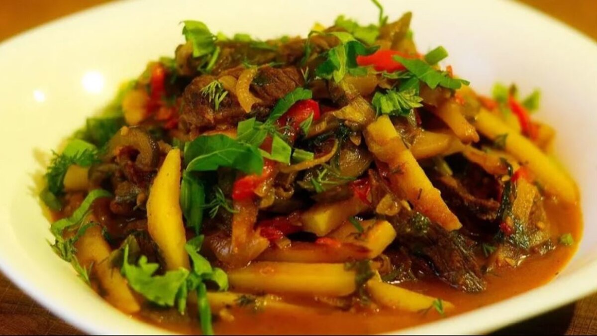 Здравствуйте мои дорогие читатели! Азу по-татарски – это татарское блюдо. На выходе получается очень нежное мясо, неповторимый вкус, все просто тает во рту. Любителям сочетания солёных огурцов и говядины точно понравится это блюдо. Я предлагаю вам вместе со мной приготовить и просто быть в шоке от того, насколько бывает вкусная татарская кухня Нам понадобится: •Говядина 1кг •Лук 1 шт •Морковь 1 шт •Картошка 10 шт •Соленые огурцы 3шт •соль, перец •бульон, если нет можно воду •лавровый лист Приготовление: 1 этап: Нарезаем мясо, Не очень тонкими, средними полосками. После того, как мы их нарежем, промываем и отправляем тушиться в казан. на 45 минут. 2 этап: Пока тушиться наше мясо, подготовим лук с морковкой. Очищаем от кожуры морковь и лук, морковь пропускаем через мелкую тёрку, лук нарезаем мелкими кубиками. 3 этап: Очищаем картофель, нарезаем средними кубиками примерно по 2 см. 4 этап: Солёные огурцы нарезаем очень мелкими кубиками. 5 этап: После того, как наше мясо п