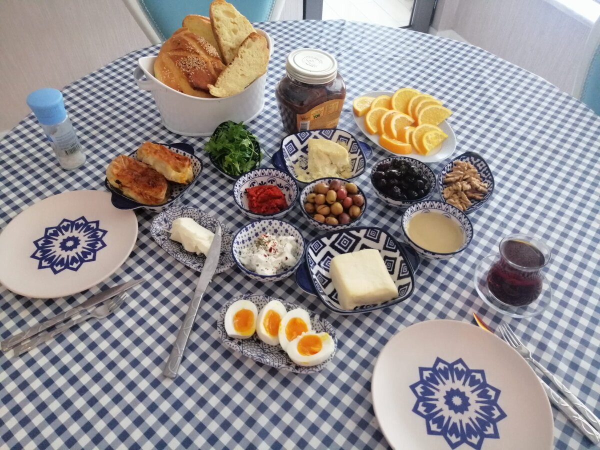 Всех приветствую 🖖. Очередной , но небольшой пост , о завтраке в Турции. Почему именно турецкий, если я живу во Франции, спросите вы? Ну а как же, если все окружение турецкое😄. В первую очередь , самое близкое окружение -супруг😌. Итак, кто хоть раз был в Турции или смотрел турецкий сериал , знает, что завтрак в этой стране называют kahvalti (кахвалты). Особенность турецкого завтрака в том , что ставится на стол практически все. Это один из самых вкусных приемов пищи. 😋Тут есть жареный перец, обжаренные колбаски, яйца варенные , жареные , омлет и всевозможные сыры. Ну и конечно свежая выпечка. Симит , бёрек и конечно пуача. Ну и про оливки , варенье и мед не забываем. Голодным встать из за такого стола невозможно.