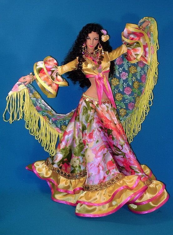 Здравствуйте. Раньше с костюмами тяжеловато было. Старались шить сами. А у меня был самый крутой по тем временам образ. Образ цыганки. Шикарная длинная юбка. Разноцветная, которая гремела на всю школу и вызывала восхищение у окружающих. Но об этом позже. Вот нашла в сети примерный образ. Моя юбка была сшита из цветных платков того времени. Смотрелось это и правда шикарно. Кофточка была из тех же платков и с волнами на рукавах. Бусы... В те времена на них была мода и поэтому дома их было очень много. В образ цыганочки входило столько, сколько шее не тяжело. А вот какие были причёски я не помню. В школьные годы волосы были всегда ниже лопаток. И заканчивался этот чудесный образ веером. Может кто-то и помнит такие. Каждый школьный новый год костюмы были разные, но всё время цыганка. Возможно сшить его было проще, чем другие. Ну а теперь про то, почему юбка вызывала взгляды. Юбка была не только красивая, но и музыкальная. Раньше лимонад продавали не в полторашках, а в стеклянных бутылк