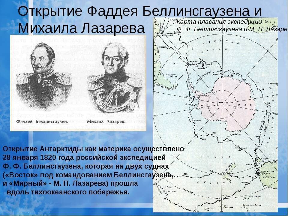 Экспедиция Ф. Ф. Беллинсгаузена и М. П. Лазарева совершила кругосветное плавание вокруг неизвестного Южного ледяного материка, девять раз непосредственно подходя к его ледяным берегам высотой от 20—30 м. Только в одном случае они увидели горный массив, свободный ото льда. Этот участок континента получил название Земля Александра I. В ходе плавания в юго-восточной части Тихого океана был открыт большой остров, практически полностью покрытый льдом, которому было дано имя основателя российского флота — императора Петра Первого.