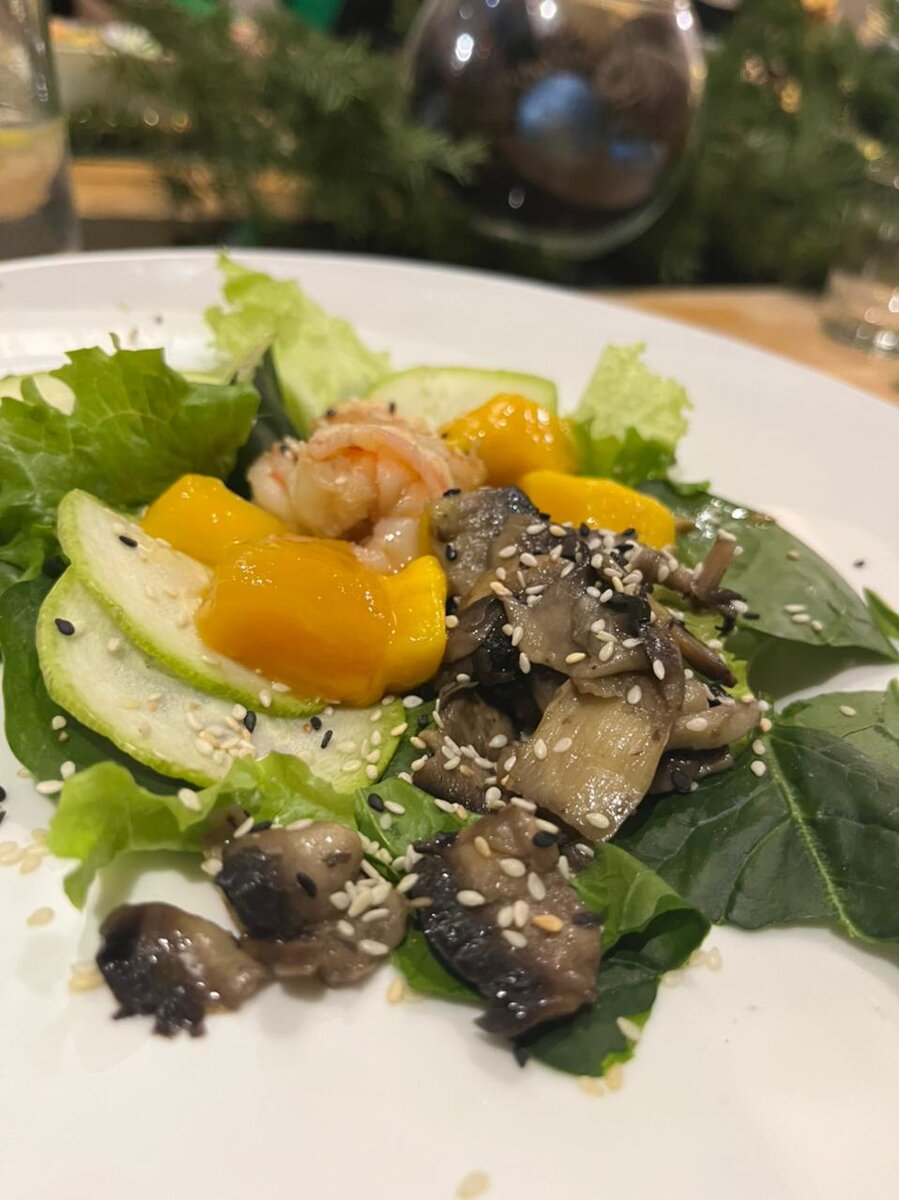 Паста с мидиями, креветками и пармезаном; салат с грибами, манго и креветками; сырный брауни с клубничным сорбетом и томлёной вишней. Таким было меню итальянского вечера в Студии вкуса Михаила Хмелинина. Это часть его ресторана Sreda. В Студии готовят не повара, а ты сам доя себя под руководством шефа. И это оказалось вкусно и интересно! Сначала мы раскатали тесто, сделали пасту. Тесто из муки, 8 желтков и оливкового масла. Получились спагетти. Оставили их сушить. Затем очистили грибы, пожарили их, высушили зелень, обжарили креветки, и собрали салат, добавив туда тонко порезанные цукини. Манго добавило блюду приятную сладость и лёгкий аромат. Для пасты почистили мидии, креветки потомили в сливках, посыпали кунжутом и щедро потерли сверху пармезаном. А с пармезаном все вкусно! Десерт собрали из запеченых брауни, солёной карамели, вишни и украсили клубничным сорбетом. Посыпали тертым печеньем. Калорийно, но порции специально очень маленькие, только попробовать. Дайте две!