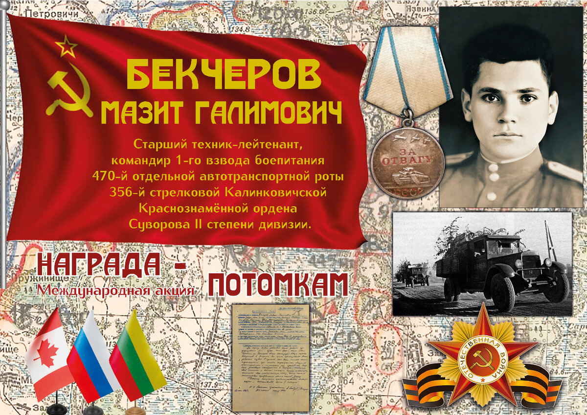 Им удалось выяснить имя владельца медали. Им оказался БЕКЧЕРОВ МАЗИТ ГАЛИМОВИЧ, 1916 г.р. уроженец Чкаловской (ныне Оренбургской области). Старший техник, лейтенант, командир 1 -го взвода 470 отдельной автотранспортной роты 356 Калинковичской Краснознаменной ордена Суворова 2 степени дивизии.