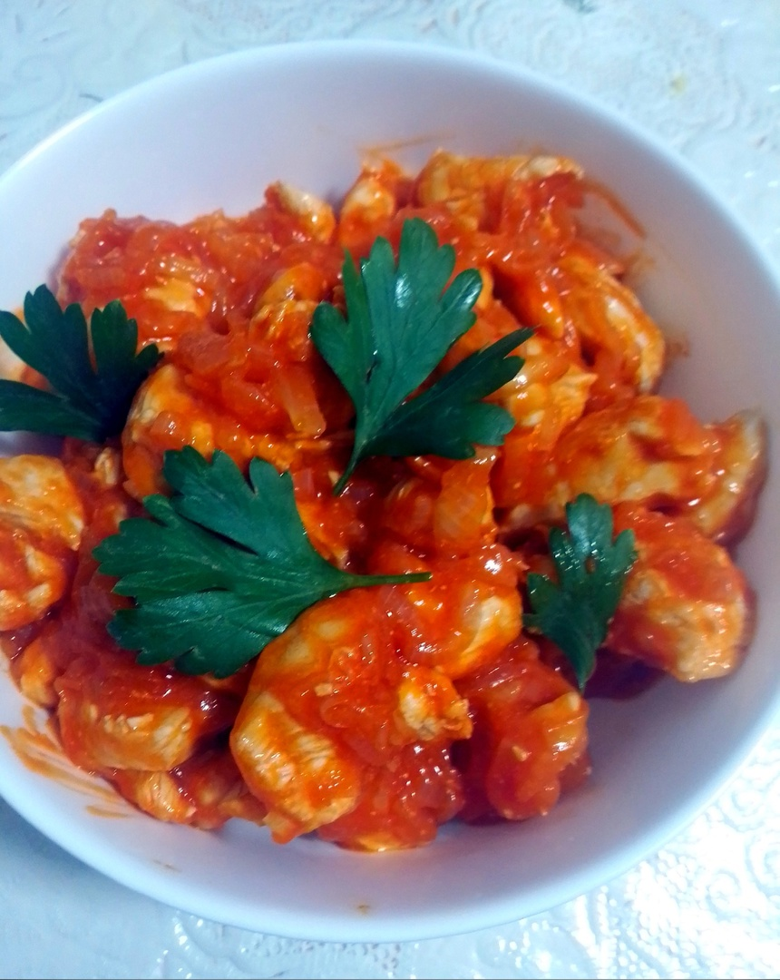 Очень простой и вкусный салат-закуска, которая разнообразит ваш праздничный или повседневный стол. Куриную грудку нарежьте средними кусочками. Нарезанное мясо залейте крутым кипятком. Вода должна полностью покрывать курицу. Быстро перемешайте, накройте крышкой и оставьте на 30 минут. Через полчаса откиньте содержимое кастрюльки на дуршлаг и оставьте на 10-15 минут, чтобы стекла лишняя жидкость. Тем временем в освободившуюся кастрюльку налейте 600 мл воды, добавьте соль, сахар, перец горошком и лавровый лист. Доведите маринад до кипения и варите 5 минут. После этого влейте 150 мл уксуса и снимите кастрюльку с огня. Именно эта горячая смесь станет отличным маринадом. Быстро переложите курицу из дуршлага в маринад, накройте крышкой и оставьте мариноваться минимум на 4 часа. Я обычно оставляю при комнатной температуре до остывания, а потом убираю в холодильник на ночь. По истечение времени нарежьте репчатый лук четверть кольцами и обжарьте на растительном масле до мягкости. К луку добавьте