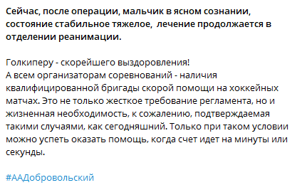 Несчастный случай произошел во время выездной игры детско-юношеской хоккейной команды «Метеор-Сигнал» из Челябинска с клубом «Олимпиец-2006» из Сургута (Ханты-Мансийский автономный округ) – голкиперу южноуральской команды конек соперника попал в шею, передает корреспондент Агентства новостей «Доступ». «Сегодня во время хоккейного матча между командами "Олимпиец-2006" и "Метеор-Сигнал" в одном из острых игровых моментов произошел несчастный случай: был травмирован вратарь команды гостей, конек игрока попал в шею голкипера», – написал в своем Telegram-канале глава регионального Департамента здравоохранения ХМАО-Югры Алексей Добровольский. Имя пострадавшего игрока не сообщается. Добровольский уточнил, что врачи оказали юному хоккеисту челябинской команды экстренную помощь на льду, затем его транспортировали в Сургутский травмцентр, где провели операцию. Глава Депздрава добавил, что сейчас хоккеист находится в ясном сознании, но в отделении реанимации, его состояние стабильно тяжелое.