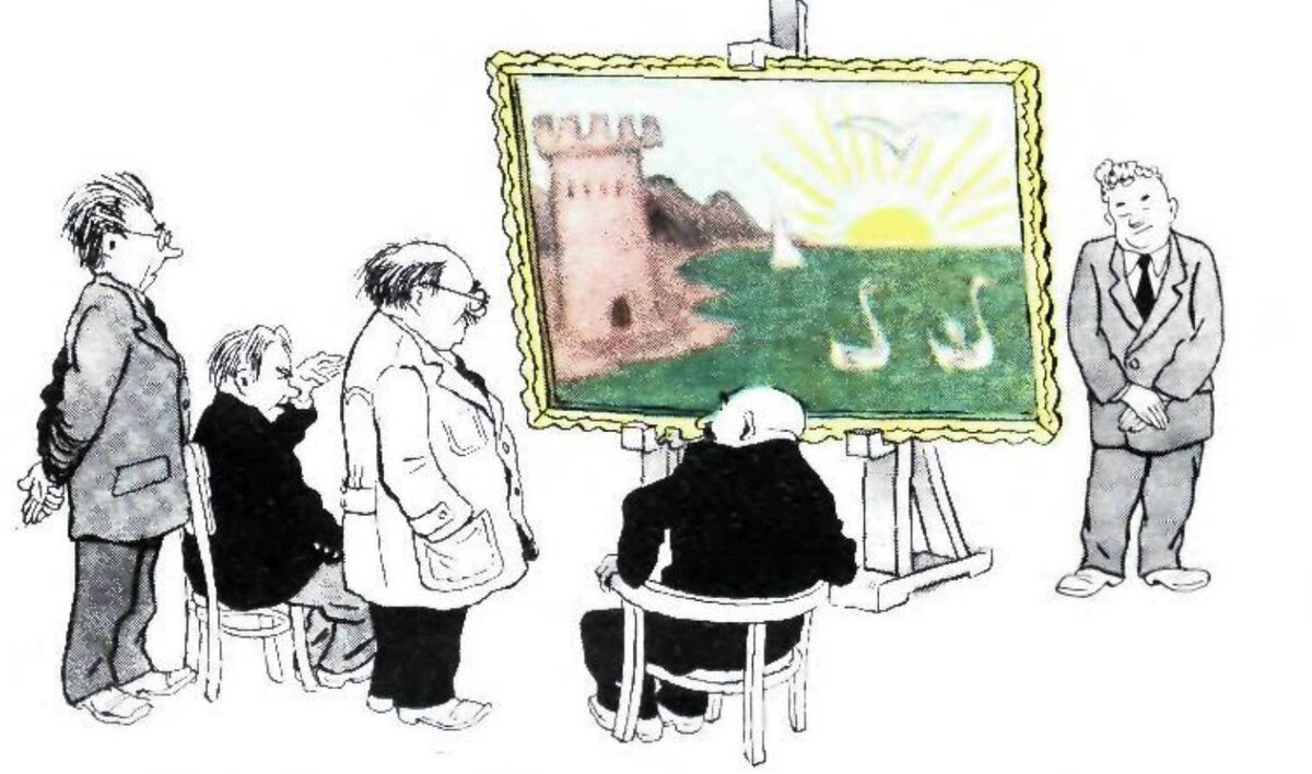 ЧЛЕНЫ ЖЮРИ: - Эту картину нужно принять! Автор её - старейший член нашего союза, активно сотрудничает в стенгазете, много внимания уделяет благоустройству нашего дома отдыха... В общем картина ясная...