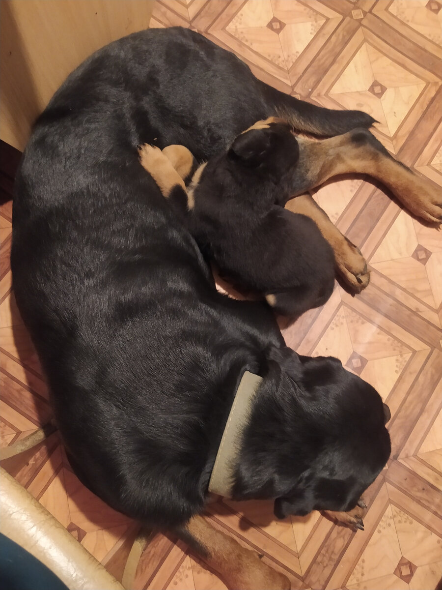 Я никогда не думала, что кобели ротвейлера бывают такими нежными и терпеливыми с маленькими щенками. Они его и за брылья кусают, за хвост тягают, а он лишь порыкивает снисходительно.