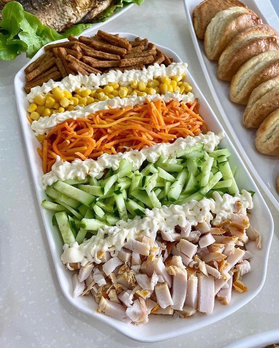 1. Очень простой и вкусный салат с копчёной курочкой и кукурузой: Что нам понадобиться: 2. Салат с тунцом: Что нам понадобиться: Соус: Если не хотите готовить соус, можно использовать готовый соус «Терияки», с ним тоже получается вкусно 3. Нежный салат с печенью: Что нам понадобиться: 4. Вкусный, нарядный салат с шампиньонами и курицей: Что нам понадобиться: 5. Салат с фунчозой и яичными блинчиками: Что нам понадобиться: Готовим яичные блинчики: Берём 3-4 яйца, слегка взбиваем венчиком, добавляем 1 столовую ложку крахмала, 2 столовой ложки растительного масла, щепотку соли, всё хорошо перемешиваем. Выпекаем на раскалённой сковороде с добавлением растительного масла с двух сторон. Все заготовки для салата, должны быть примерно равными частями. Собирать салат можно кучками или дорожками, как вам больше нравиться. После подачи необходимо его размешать. Какой рецепт вам понравился? Пишите в комментариях. Готовьте с удовольствием! Приятного аппетита!