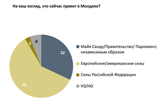 Молдовой «руководят американские или европейские силы», полагают большинство жителей Молдавии, участвующих в опросе, проведенном Институтом маркетинга и исследований IMAS. Опрос был проведен с 10 по 29 ноября, в нем приняли участие 1100 человек из 90 населенных пунктов, погрешность составляет 3%. Согласно исследованию, о том, что Молдовой «руководят американские или европейские силы», заявили 59% опрошенных граждан (см. таблицу). Еще 32% считают, что страной руководит действующий президент Молдавии Майя Санду, правительство или парламент. Еще 3% высказались, что их государством управляют российские силы, 6% затруднились ответить. На вопрос о том, «насколько вовлечен в дела страны президент», 39% респондентов ответили, что Санду вообще ими не занимается. Еще 25% опрошенных молдаван заявили, что внутренним проблемам не уделяют должного внимания, а 23% сказали, что Санду много занимается делами страны. Жители Молдавии также высказались по поводу того, «улучшилась ли жизнь в стране за два