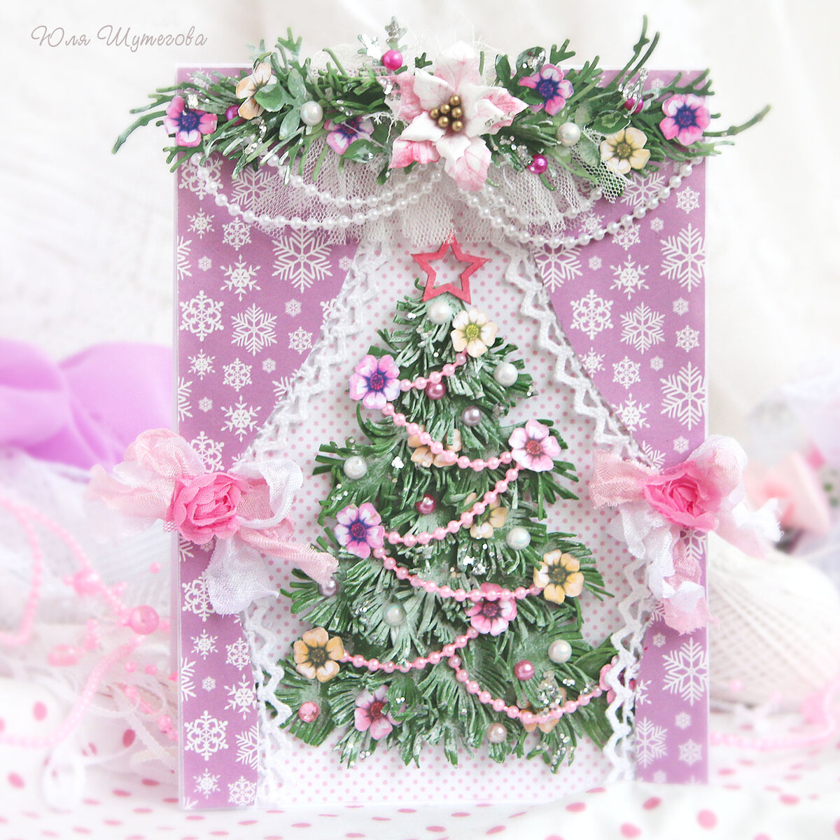 Доброго времени суток! Приглашаю вас окунуться в атмосферу новогодней сказки и насладиться деталями сказочно-красивой открытки с елочкой ручной работы. Представленная открытка выполнена в нежной цветовой гамме: белый, розовый, серый (серебро). Эти оттенки не являются классикой новогодней палитры, но мне очень нравятся работы в нежных цветах. Размер открыточки 18 х13см Основа открытки из плотного дизайнерского картона, оформлена дизайнерской бумагой для скрапбукинга белого цвета с мелкими розовыми звездочками. Главным декоративным элементом здесь является нарядная елочка. Она сделана из фоамирана и украшена жемчужными нитями розового цвета, авторскими отрисовками (цветы), половинками бусин, глиттером и чипбордом звездочкой. Елочку обрамляют красивые занавески из дизайнерской бумаги сиреневого цвета с ажурными снежинками. Край занавесок оформлены кружевом, шелковыми бантиками и шифоновыми розочками. В верхней части открытки красуется цветочная композиция из веточек и листиков, в центре к