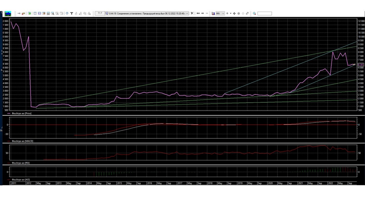На российском фондовом рынке есть еще интересная акция Фосагро, которая платит дивиденды, каждый квартал, как обещает, будет платить в 2023 году. Пока такая надежда есть, значит есть смысл держать такую бумагу в своем инвестиционном портфеле. Как пишет компания Фосагро в декабре 2022 года будут выплачены последние дивиденды в размере 318 рублей за одну акцию, выплата будет проводится 2 января 2023 году. Закрытие реестра по начислению дивидендов, будет проведено 19 декабря 2022 года, теперь с помощью технического анализа определим динамику движения акции до конца 2022 года. Как показывает месячный график акции Фосагро, события 24 февраля 2022 года, никак не сказалась на динамику растущего коридора 6000-9500. Хотя 24 февраля 2022 года была попытка сломать тренд роста, акция Фосагро уходила на уровень 4900, но стратегические инвесторы быстро забрали данный пролив и вернули акцию в растущий коридор 6000-9500. Рост закончился в июне, как были начислены дивиденды, после пошел процесс пониж