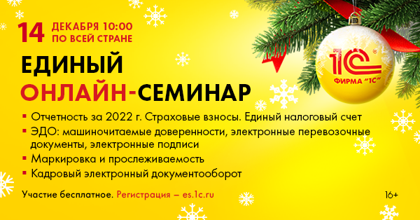 Уже 14 декабря 2022 фирма “1С” проведет БЕСПЛАТНЫЙ Единый онлайн-семинар 1С для бухгалтеров, директоров и руководящих должностей об учете и налогообложении организаций, автоматизации, полезная информация и лайфхаки о том, что нужно учесть при сдаче отчетности за 2022 год.