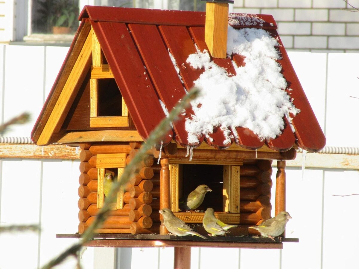 Сквозь сон встречает утро года.... Неотъемлемым атрибутом любого сада является скворечник или кормушка для птиц. Игорь - муж Ани - мастер по дереву. В свободное от работы время рукодельничает, делает для сада полезные вещи. Такая шикарная двухэтажная столовая для пернатых в зимнее время - настоящее спасение. Столуется здесь разная братия - от вездесущих воробьев до красногрудых снегирей. Весеннее оживление природы невозможно представить без задорного пения зеленушек. Эти лесные канарейки с ярким оперением оливкового цвета, с удовольствием благодарят гостеприимных хозяев своими звонкими выразительными трелями.