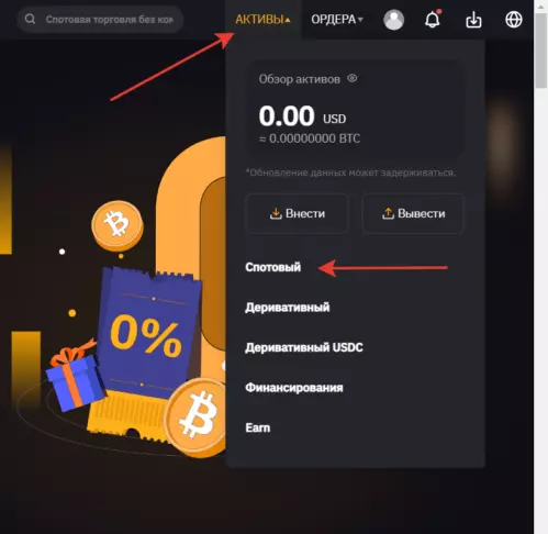 В правом углу выберете поле АКТИВЫ и перейдите во вкладку СПОТОВЫЙ