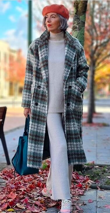 - Тёплый трикотажный костюм – отличный выбор для зимы. Он мягкий, удобный и вполне современный. Модель простого покроя из светло-серого трикотажного полотна вполне может пополнить ваш базовый гардероб. Костюм состоит из прямых брюк и туники, такая модель хорошо будет смотреться на фигуре любого цвета. Костюм дополнен длинным шерстяным пальто из ткани в клетку. Комплект дополнен цветными деталями: фетровым беретом кирпичного оттенка, синей сумкой, и серо-розовыми кроссовками.