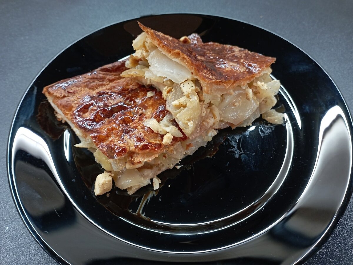 Нужно: Тесто слоеное дрожжевое - 2 пласта, Яйцо - 5 шт., Капуста - около 500 гр., Соль/перец - по вкусу. Что делать: Тесто размораживаем, противень застилаем бумагой и смазываем сливочным маслом, растягиваем один пласт по противню, лучше не очень тонко, иначе пирог будет рассыпаться. Второй пласт растягиваем и делаем проколы вилкой. Отвариваем 4 яйца, и мелко нарезаем или давим вилкой. Капусту нарезаем как нравится, обжариваем на сковороде до золотистого цвета, добавляем яйца и специи, жарим еще минуты 3-5. Даем остыть немного, затем выкладываем на тесто, вторым пластом накрываем, соединяем по краям, смазываем взбитым яйцом и убираем в предварительно разогретую до 180С° духовку на 30-40 минут. #пирогскапустой #пирогскапустойияйцом #простойпирогскапустой