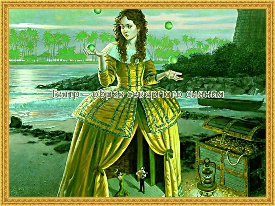 Настоящая космическая любовь солнца и земли, проявляющаяся в солнечном ветре и северном сиянии высоко в небесах, над театром. Театр - образ северо-сиятельной любви. Весь мир театр, женщины мужчины в нём актёры, но это касалось Лондона, только англосаксы актёры, а нас даже на место зрителей не пускают. Но у нас есть верное сияние, и мы можем непосредственно наслаждаться космической любовью, а не смотреть в театре фантазии драматургов и актёров, так может вся жизнь пройти мимо. Не туда надо смотреть. Театр (греч. место для зрелищ, затем — зрелище, от смотреть, видеть) — зрелищный вид искусства, представляющий собой синтез различных искусств и обладающий собственной спецификой: отражение действительности, конфликтов, характеров, а также их трактовка и оценка, утверждение тех или иных идей здесь происходит посредством драматического действия, главным носителем которого является актёр.