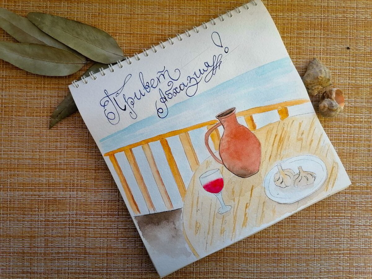 Это первый мой тревел-скетч, судить строго не надо. Пока я его делала у меня возникло куча идей как создать следующий и уже круче в 100 раз! Но об этом потом. Рисунки я дополняла интересными фактами . В Абхазии я была уже два раза : в прошлом и в этом году. Ну понятно уже, что страна мне понравилась, раз я еще решила туда вернуться. Проживали мы в Сухуме. Естественно, самое главное это море, на берегу которого мы загорали, пили местное вино и просто отдыхали .Никаких мыслей в голове, только шум волн и легкий ветерок. На берегу было довольно много местных собак, которые хотели от нас лакомства, но кроме стакана мне было нечего им предложить.)) Море, скажу, где мы отдыхали очень чистое, а пляж галечный. Кстати, а вы собираете гальку? Я вот помешана на маленьких камешках, потом я ими цветочные горшки украшаю. На море повалялись, надо и в город съездить. В Сухуме замечательная набережная , по которой приятно прогуляться . А еще там есть замечательное кафе , где бомбические хачапури. И це