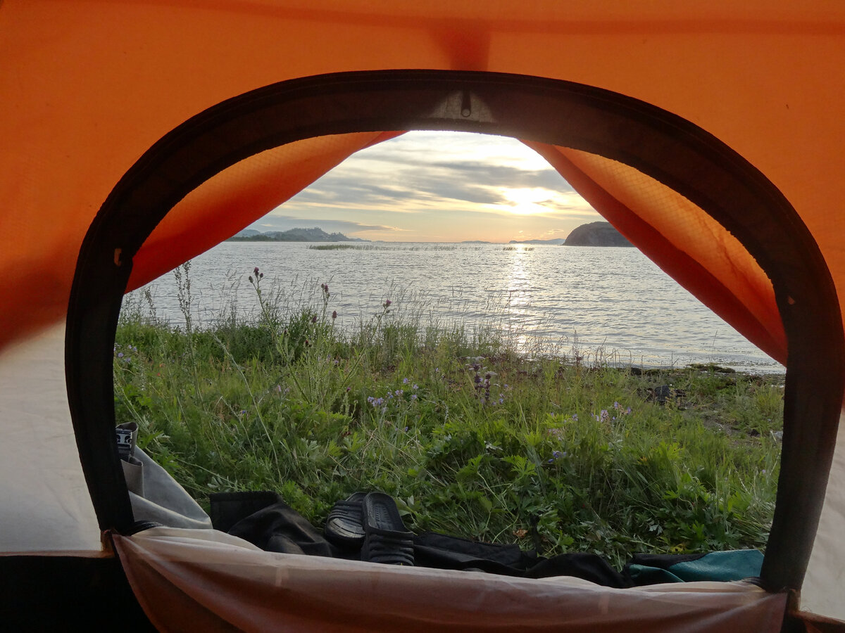 «Напоследок Белое море устроило нам ещё одну проверку "на прочность". Пока отдыхали, начал поддувать ветерок попутного направления. До завершения похода оставалось пройти километров десять, и мы решили сделать последний финишный рывок. Пока шли за островами, было терпимо, но потом острова кончились, и осталось только море, ветер, белые "барашки" волн и мы в байдарке. Напомню, что нас трое в двухместной лодке. Борт едва возвышается над водой. Ветер усиливается, но, на наше счастье, дует нам прямо в корму. Лодка то взлетает на гребень очередной волны, то проваливается вниз, как на огромных качелях. Мы гребём, стараясь не оглядываться назад, откуда набегают устрашающие волны. Некоторые из них, по нашему общему мнению, не менее двух метров. Самые неприятные - это волны с "барашками" пены, которая перехлёстывает через борт, добавляя остроты нашим впечатлениям. Кто-то из нас потом выразился очень образно: "Мы летели по морю впереди собственного визга!" Часа два продолжалась эта пляска на волнах и вот, наконец, мокрые, но счастливые, мы ткнулись в берег. Всё! Поход завершён».