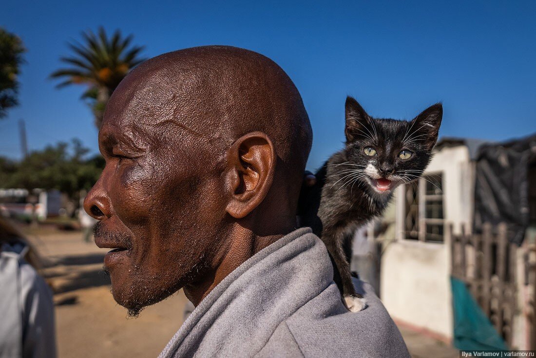 А это трущобы, точнее, тауншипы. В эпоху апартеида за пределами городов ЮАР строились посёлки, куда выселяли всех небелых жителей. Они-то и назывались "тауншипами". Ещё один распространённый термин – "локейшн", или "локаси", если на африкаансе.