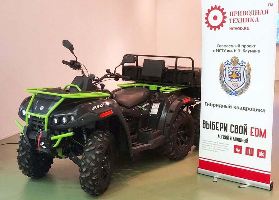 Первые шаги к этому сделали ученые МГТУ им. Н.Э. Баумана и инженеры АО «Русская механика», совместными усилиями которых был создан мотовездеход с колёсной формулой 6×6. Детище науки и производства было представлено на встрече участников Московского кластера электромобилестроения. Как сообщила пресс-служба «Русской механики», машина разработана кафедрой СМ10 «Колёсные машины» Бауманского университета вместе с компанией АО «Русская механика» на базе квадроцикла «РМ 650-2» с грузовой платформой. Инженеры МГТУ выполнили перекомпоновку узлов, интегрировали электропривод и внедрили алгоритмы управления вездехода на шесть колёс. Максимальная скорость такого аппарата — 96 км/ч, а при скорости 60 км/ч его запас хода составляет 200 километров, что для внедорожной техники довольно много, особенно с учетом масса этого гексацикла. Мотовездеход «РМ650» в базовом исполнении предназначен для транспортировки людей и грузов весом до 350 кг в условиях бездорожья. Он уверенно идет даже по снегу, если его