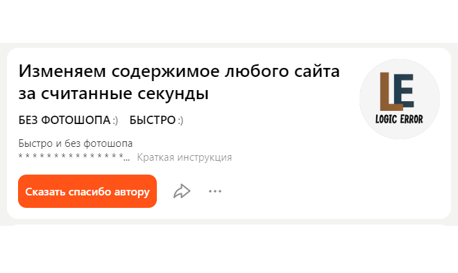 Приветствую всех, и сегодня я расскажу, как можно легко изменить практически любой текст на сайте для скриншота за пару кликов. Я думаю многие в таком случае полезут в фоторедактор и минут 30 подбирая шрифт, еще минут 0 будут изменять содержимое. Однако эту проблему можно решить намного быстрее. Суть этого способа заключается в изменении кода страница "у клиента". Как это сделать? Для начала открываем интересующую нас страницу в браузере Тут нет ничего интересного. Но мне хочется изменить текст на кнопке "подписаться" и вообще множество надписей Для этого нажимаем ПКМ по нужному элементу нажимаем "Просмотреть код", "Инспектировать код" и т.д. (зависит от браузера). После чего примерно в середине консоли справа у нас откроется код определенного элемента. По нему можно нажать двойным кликом и изменить содержимое на произвольное. Далее можно закрыть консоль и сделать скриншот Послесловие Такой способ работает с большинством сайтов, он позволяет изменить текст не меняя (ну или меняя) шр