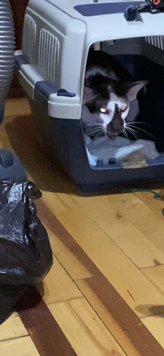 В назначенный день и час забираю кошку из поезда. Всю дорогу в машине мяукает. Дома открываю дверцу переноски, а она шипит и кидается. Кошка была в ужаснейшем стрессе. Знакомить с котом даже не стала. Спустя время она конечно же вышла и местом своего проживания и укрытия выбрала ванную, точнее под ванной. Выходила она только ночью, когда все были по кроватям. Своего кота запирала, чтоб кошечка могла освоить территорию. Так мы с ней около недели купались, по нужде ходили, короче все, что делают в ванной. Конечно же мы с ней разговаривали, игрушки приносили, погладить пытались, вкусняшками обманывали- а она игрушку под ванну затащит и там играется. Очень долго привыкала к новому дому. Когда она уже освоилась и позволила взять себя на руки, стали видны проблемы со здоровьем. Во-первых, порвано ухо ( на фото ухо целое). Во-вторых, сильный запах из пасти. И в-третьих, один глаз все время слезится и поэтому весь в козявках. Пришлось отложить поход к ветеринару ещё на неделю, боялась