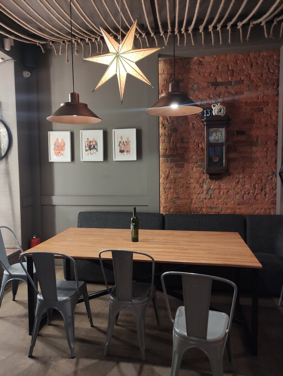 Ресторанчик, специализирующийся исключительно на сербской кухне, я нашла по отзывам. Искала какую-то новую кухню в центральной части Петербурга по бюджетным ценам для обеда. Всем этим критериям, на первый взгляд соответствовал ресторанчик Ukusno, расположенный возле метро Садовая. Рейтинг на Яндекс Картах здесь более чем достойный - 4,9 балла. Место это посетили, сербскую кухню (лично я впервые в жизни) попробовали, теперь делюсь фото и впечатлениями. Интерьер и меню Интерьер бюджетен, но достаточно уютен и с фантазией. 2 зала с добротной лаконичной деревянной мебелью (впрочем, за отдельными столиками встречаются и мягкие диванчики). В оформлении стен красный кирпич сочетается с серым графитом, с потолков свисают массивные золотые звезды. Для антуража на потолке привязаны десятки канатов. На стенах небольшие картины, графические рисунки архитектуры, висит флаг Сербии, цветами напоминающий российский. Меню черно-белое, к сожалению, без фото. Небольшое, но эксклюзивное. В меню лишь сербс